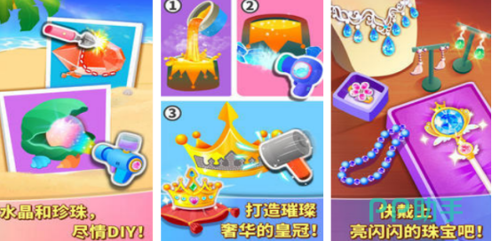 宝宝巴士所呈现的热门游戏,公主与王子即将结婚,需要在奇妙珠宝店当中定制亮闪闪的珠宝,发挥你的创意,帮助他们自由设计,可以到海滩中寻找贝壳,取出珍珠,并染上各种颜色,再搭配蝴蝶结穿成项链给公主佩戴完成,让其成为闪耀全场的公主,还可为其制作皇冠,设计,并添加各种宝石与钻石进行点缀,让皇冠光彩夺目。