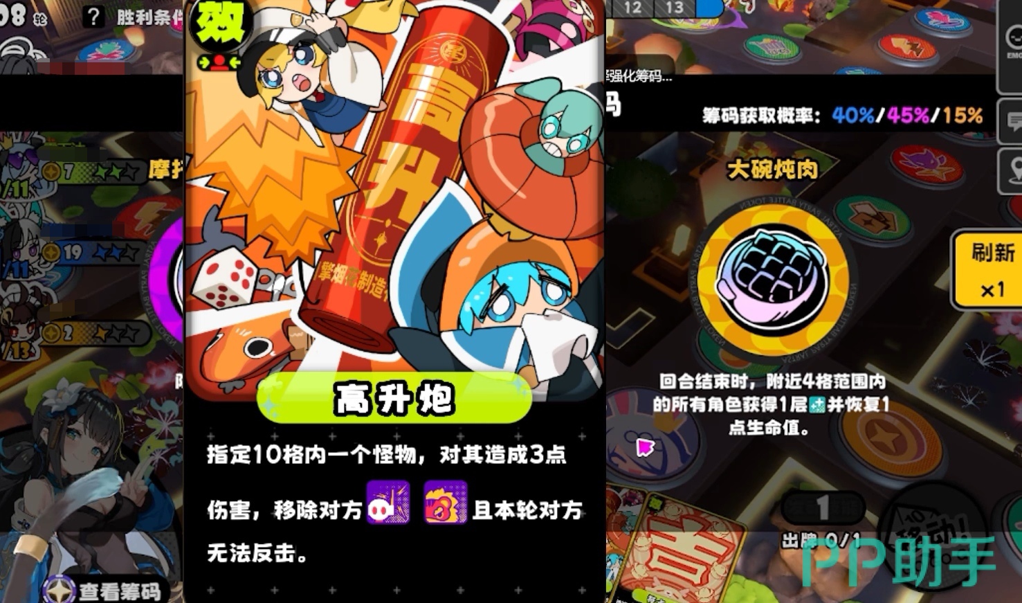 除两大BOSS外,地图还存在两类常规怪物:氛围机器人与爆竹呱呱。氛围机器人每回合必施放【炒热气氛】,对周围4格内所有敌方单位(含自身)各提升1点攻击力与1点防御力,该增益效果不可驱散且随回合数递增,是全图最关键的压制点。爆竹呱呱具有碰撞判定但无反击能力,每回合自动锁定范围内血量最高的玩家,按自身攻击力造成伤害;被击破后必定掉落关键道具卡【高升炮】——此卡可指定10格内任意敌方单位,造成3点固定伤害并清除其所有增益状态,是贯穿整局的核心输出手段。
