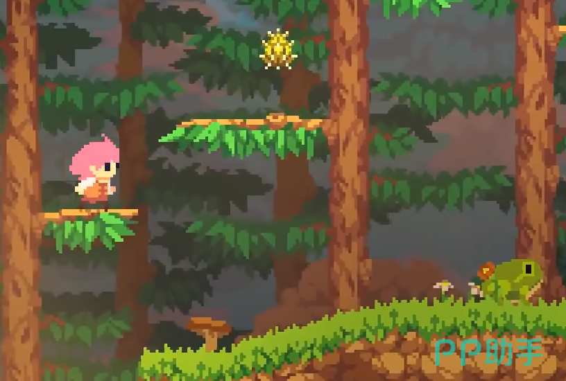 下一区域入口处设有一宝箱,需蹲伏滑行通过狭窄通道方可取得。拾取后向上移动,在岔路口将同时遭遇史莱姆与青蛙。推荐优先清理史莱姆,因其行动模式更易预测,可降低战斗容错压力;再集中应对跳跃频繁的青蛙。随后攀爬树枝路段时需留意:每根树枝仅支持单次站立,连续踩踏将导致断裂。