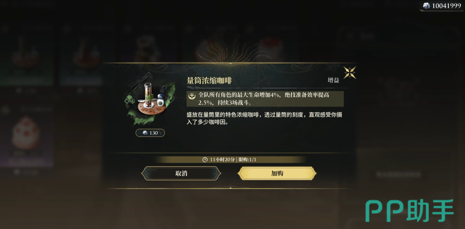 店内商品以银子为通用货币结算,涵盖多款特调浓缩咖啡及配套甜品。其中量筒浓缩咖啡具备明确数值化效果:饮用后可使全体队友最大生命值提升4%,同时提高大招释放效率。所有饮品均需通过“结算”动作完成生效流程,未结算前仅暂存于购物车,不触发任何增益。