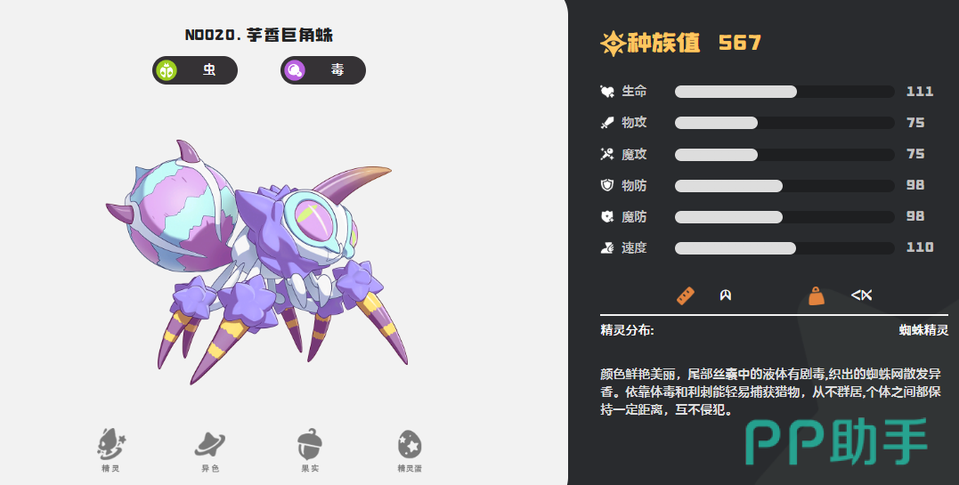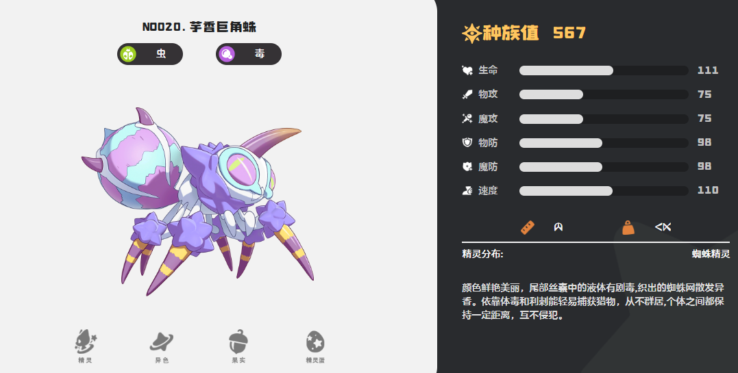 芋香巨角蛛承担毒素体系构建任务,其特性为:当敌方使用低能耗技能时,目标将陷入中毒状态。技能组合推荐「以毒攻毒」——中毒状态下持续提升自身攻击力;「毒液渗透」用于叠加毒素层数并造成魔法伤害;「防御」确保其在毒伤积累阶段的存活率;「扬沙」补充中等强度物理输出,完善伤害维度。