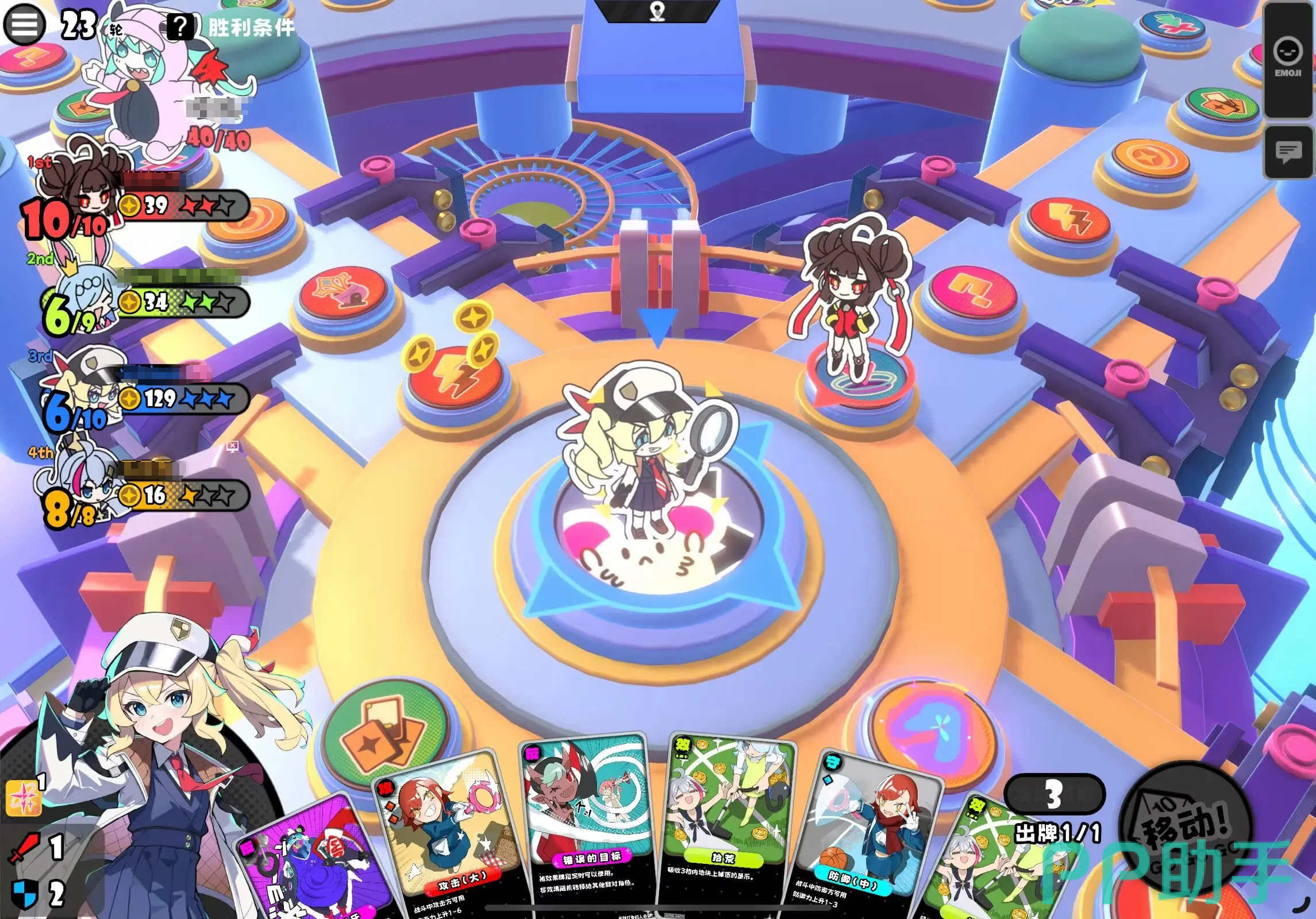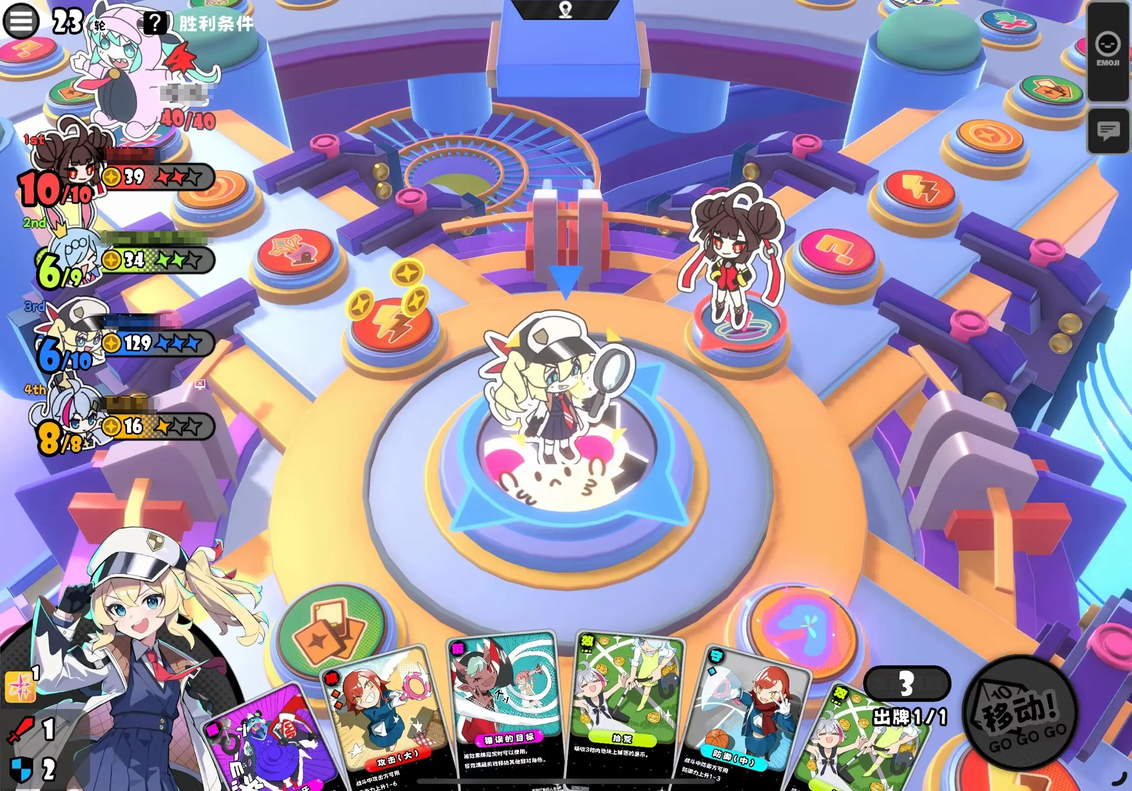 角色与卡牌构成策略纵深。游戏提供多定位角色,新手推荐优先选用具备治疗或金币增益能力的辅助型角色,以提升队伍容错率与发育稳定性。卡牌系统具备强干预性:例如在对手临近兑换节点时,使用阻断类卡牌可延缓其进度;当自身生命值偏低,及时启用防御类卡牌能有效规避风险。建议在对局中主动关注卡牌掉落点与刷新规律,提升关键资源获取效率。