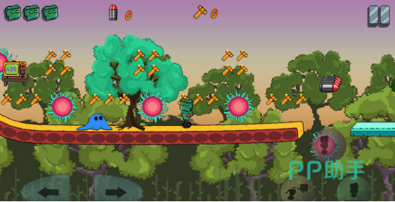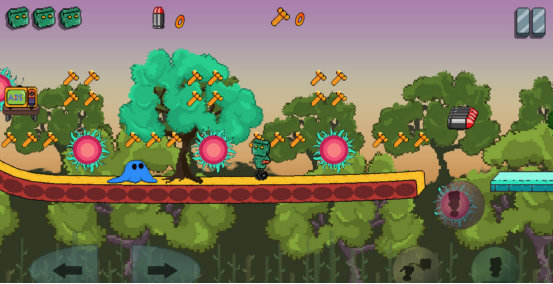 复古像素美术风格打造,操作界面简洁直观,左下区域集成方向键与跳跃/攻击按钮。主角以头部撞击为主要近战方式,亦可通过双手发射子弹进行远程压制。敌方机器人具备差异化AI行为模式,部分关卡需结合地形掩体与节奏闪避完成突破,整体节奏紧凑,强调反应速度与操作连贯性。