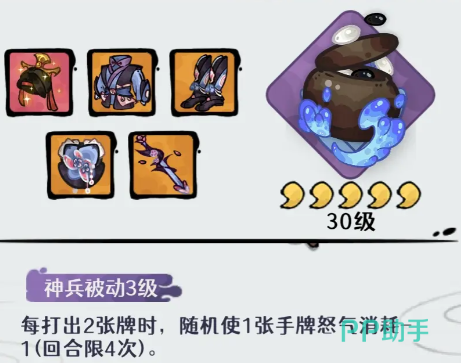中毒协同型神兵:每当己方成功施加中毒效果时,即从手牌或牌库中随机选取1张技巧类卡牌,使其怒气消耗减少1点;战斗初始阶段,为全体友方单位提供12%攻击力加成。该神兵与毒系武学、控制流阵容深度绑定,可有效放大技巧卡牌使用频次与整体输出效率。