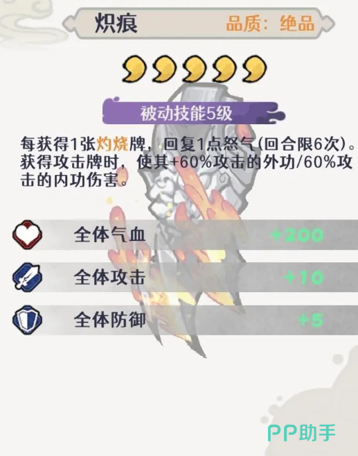 机制设计聚焦灼烧体系:每成功打出一张灼烧类卡牌,即可回复1点怒气(单回合最多6次);同时,当使用攻击类卡牌时,额外提升60%外功与内功伤害。此神兵与火系武学、持续伤害型角色高度契合,可显著强化爆发节奏与连招密度。