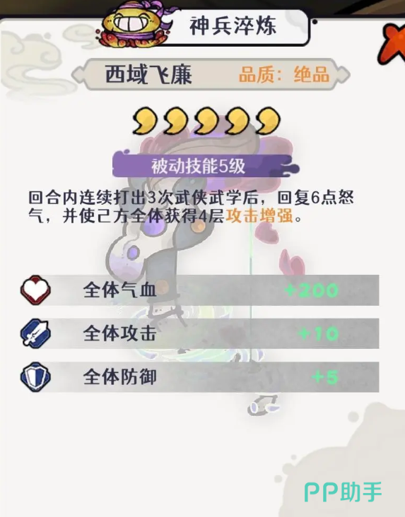 基础属性提升:全体气血+200、全体攻击+10、全体防御+5;主动触发机制:当己方武侠在一回合内连续使用3次武学后,立即恢复6点怒气,并为全体友方单位叠加4层“攻击增强”状态。该效果节奏稳定、触发门槛低,特别适合高频出牌流派,是团队输出续航的关键支点。