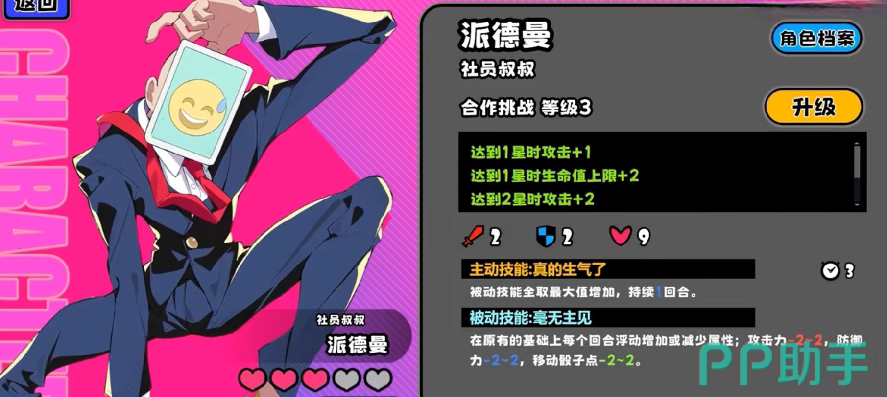 派德曼的核心机制由主动技【真的生气了】与被动技【毫无主见】共同构成。释放主动技能后,可使被动技能的属性浮动上限提升,持续1回合;而被动技能本身则每回合动态调整三项基础数值:攻击力在-2至+2区间内随机变化,防御力与移动骰子点数同样遵循该浮动范围,形成不可预测但可引导的战斗节奏。