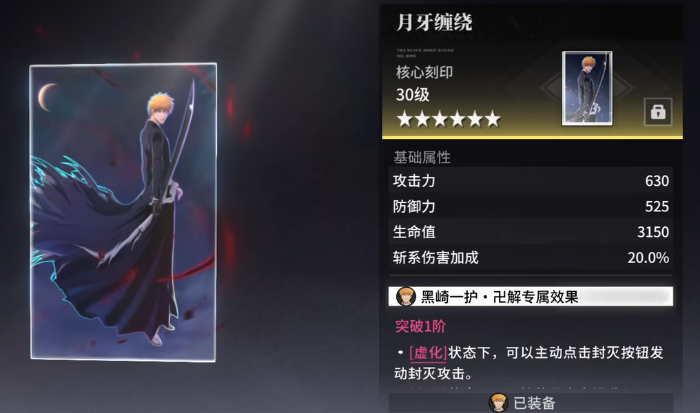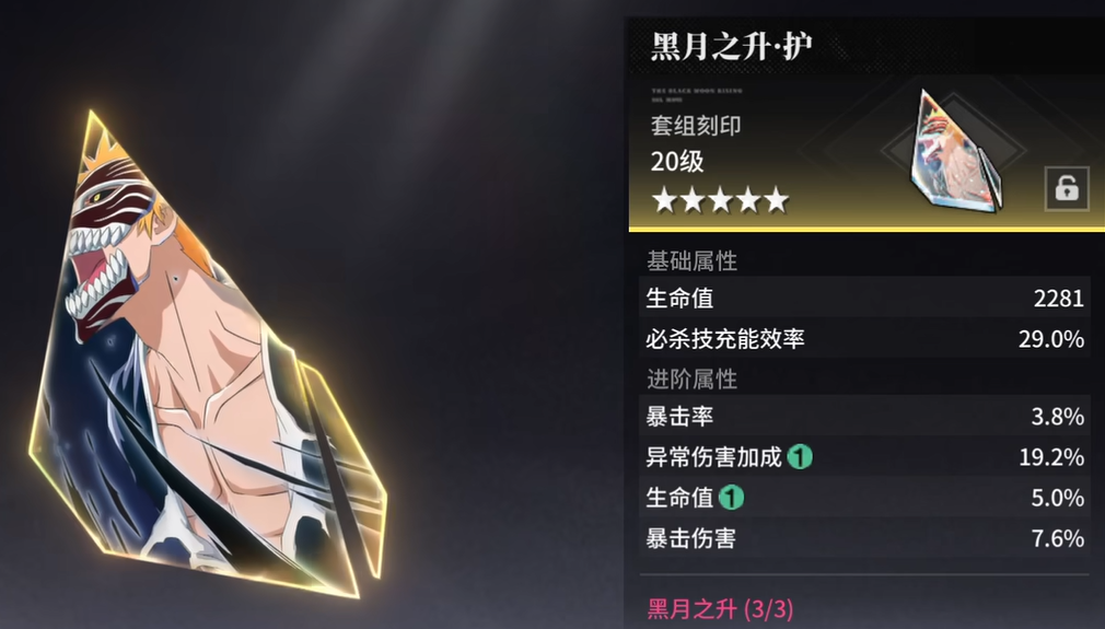 先说套组刻印的三个位置。第一个位置是黑月之升-霸,主属性是随机的,最好能刷出斩系加成。因为卍解一护的输出主要靠斩系伤害,这个属性加成直接影响技能倍率。第二个位置黑月之升-灭,建议选暴击率。有人可能觉得暴击伤害更好,但其实卍解一护有个被动机制,暴击率超过100%之后,每多出1%就会转换成1.5%的暴击伤害。所以堆暴击率对他来说收益更高,不会浪费。第三个位置黑月之升-护,这个位置主属性选必杀技能充能效率。卍解一护打输出很依赖必杀技,充能快了才能频繁放大招,输出循环才顺畅。