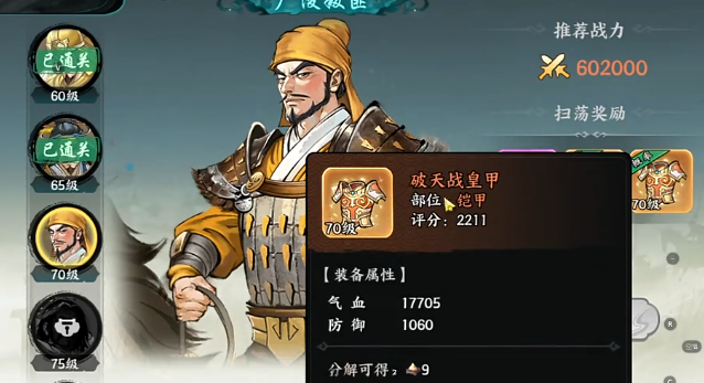 那这里就需要说到坐骑的配装,在扫荡之后就能获得70级的橙装,破天战黄甲。这一个装备的强度还是很有优势性的,可以直接和坐骑搭配在一起。在装备之后评分可以直接提升到2211,气血暴涨17,000,防御还会增加1000。要知道70级的装备在游戏中本身就是一种稀缺资源,没有其他的购买或者是兑换渠道,而一旦在拥有之后搭配坐骑,无论是选择什么样的坐骑,都能让生存能力得到质的飞跃。后续在挑战高难度副本时,底气十足。