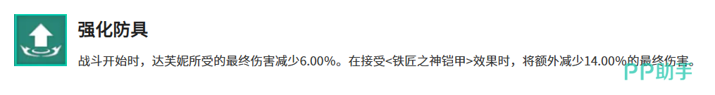 赫菲斯托斯神锤最核心的效果就是强化防具这个属性。战斗一开始的时候,达芙妮受到的最终伤害就会直接减少6个百分点,这个减伤虽然看起来不算特别多,但是在实战当中效果相当明显。更关键的是当她触发了铁匠之神铠甲这个buff的时候,减伤效果还会额外增加14个百分点,加起来就是20个百分点的最终伤害减免了。这个数值在前期已经够用,后期如果把遗物升到满级,减伤能力还会进一步提高。