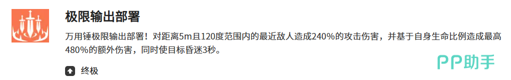 极限输出部署这个终极技能伤害倍率挺高的,对5米范围内120度扇形区域的敌人造成240个百分点攻击伤害,还会根据自身血量比例追加最高480个百分点的额外伤害。不过达芙妮毕竟是个捍卫者,输出能力不是她的强项,这个大招主要还是用来控制敌人,3秒眩晕时间能给队友创造不少输出机会。支援技能补充精力可以在使用主要技能后给全队减少30个百分点最终伤害,持续10秒,这个效果跟遗物的减伤叠加之后,能让整个队伍的生存能力得到明显提升。