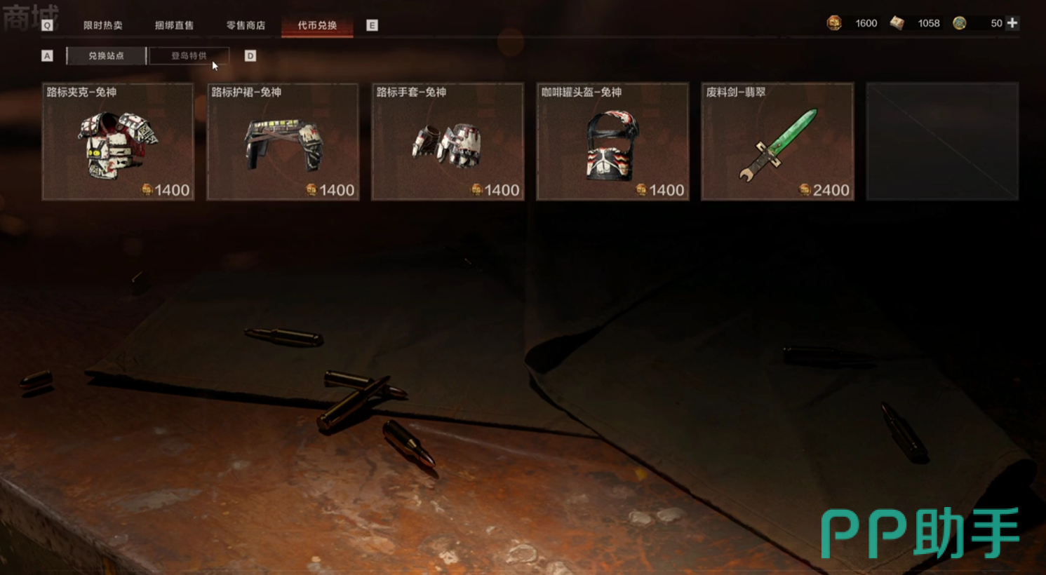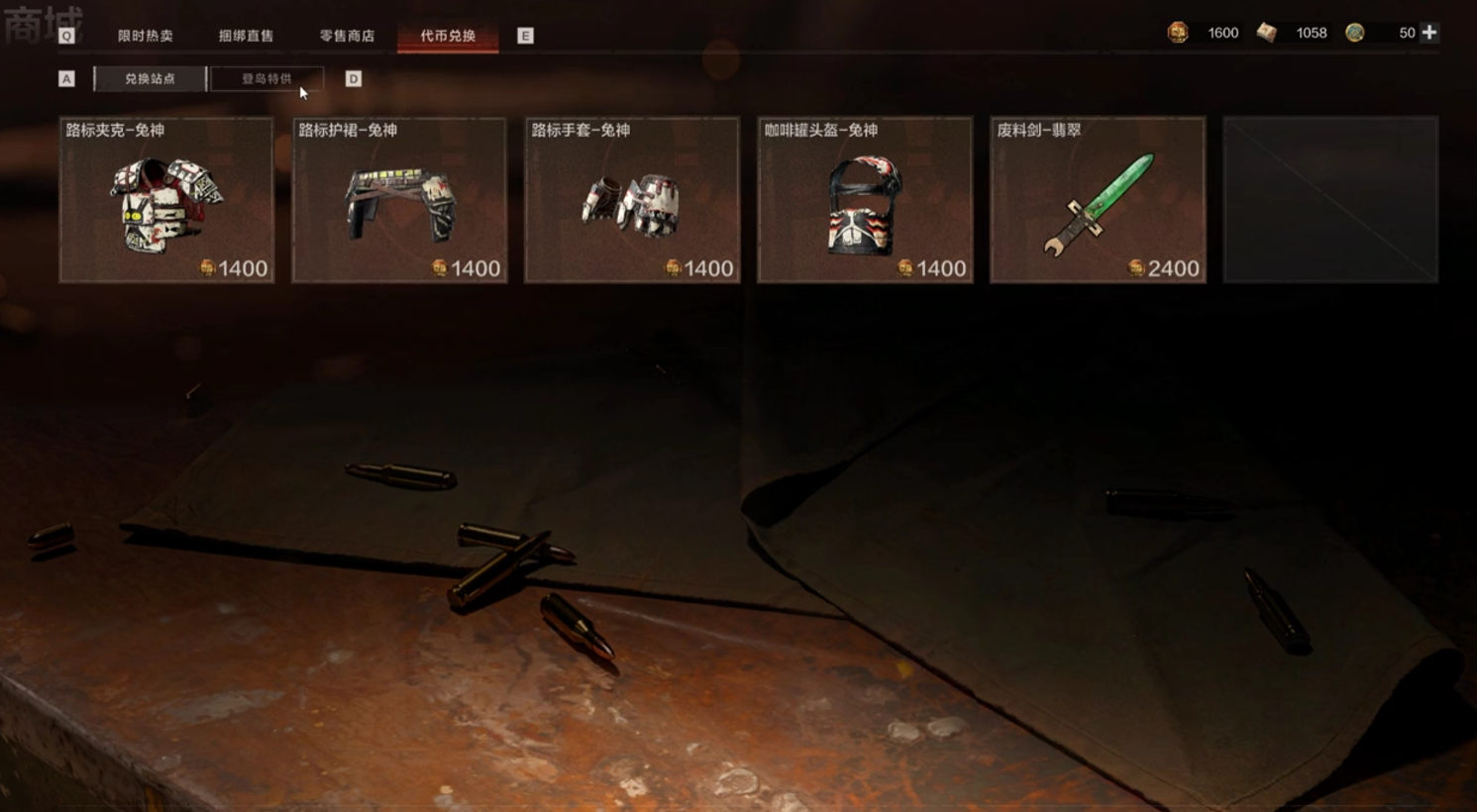 然后他在商城中还有着一个代币兑换的商店,在这个代币兑换的商店中,这个代币兑换的又是另外一个兔神系列,玩家们能够获取这个系列的路标夹克、路标护裙、路标手套、以及咖啡罐头盔和废料剑的新皮肤,一共有5个物品可以让玩家们获取,除了废料剑需要2400的代币,其余每一个物品获取需要的都是1400代币。