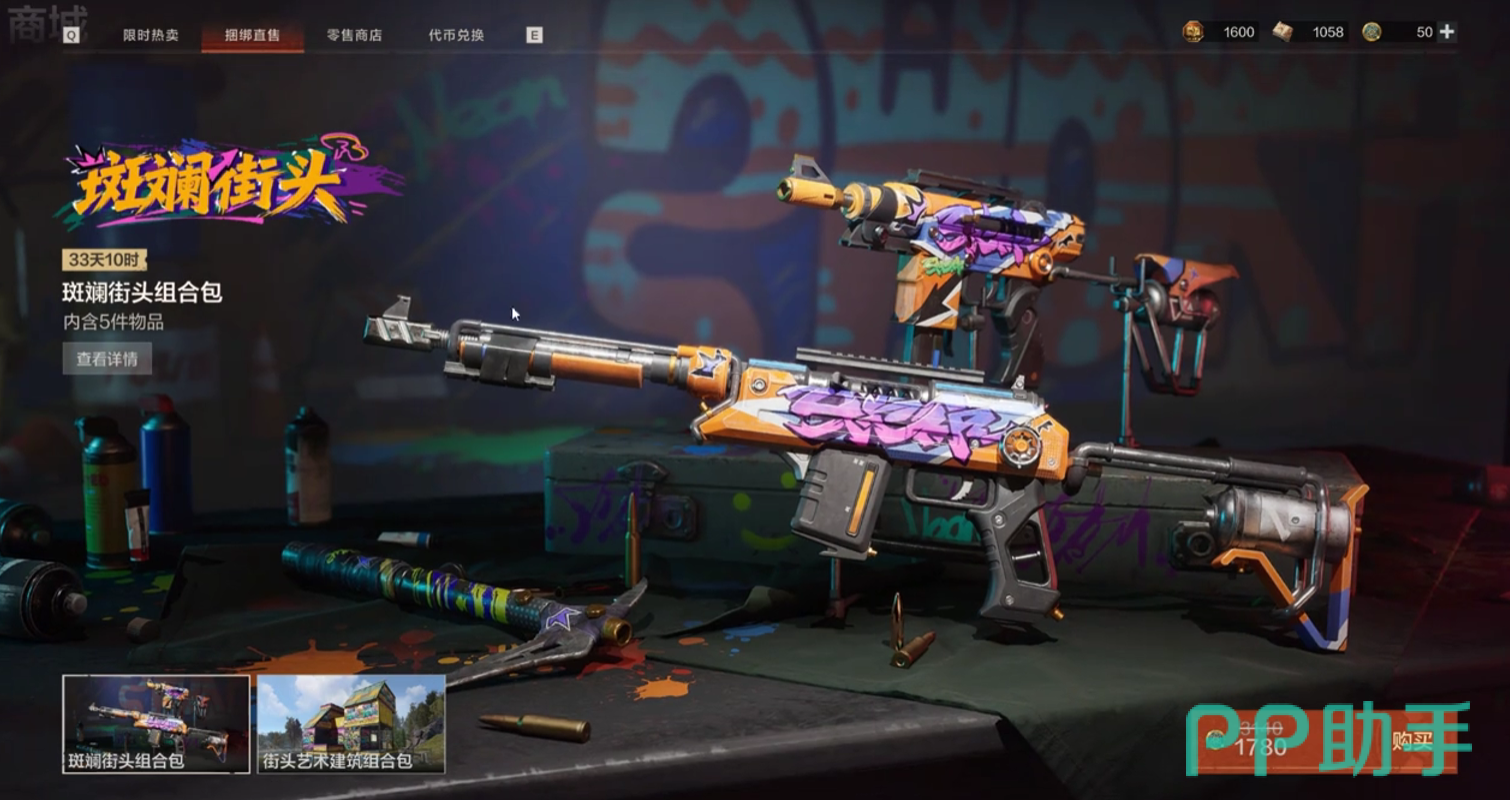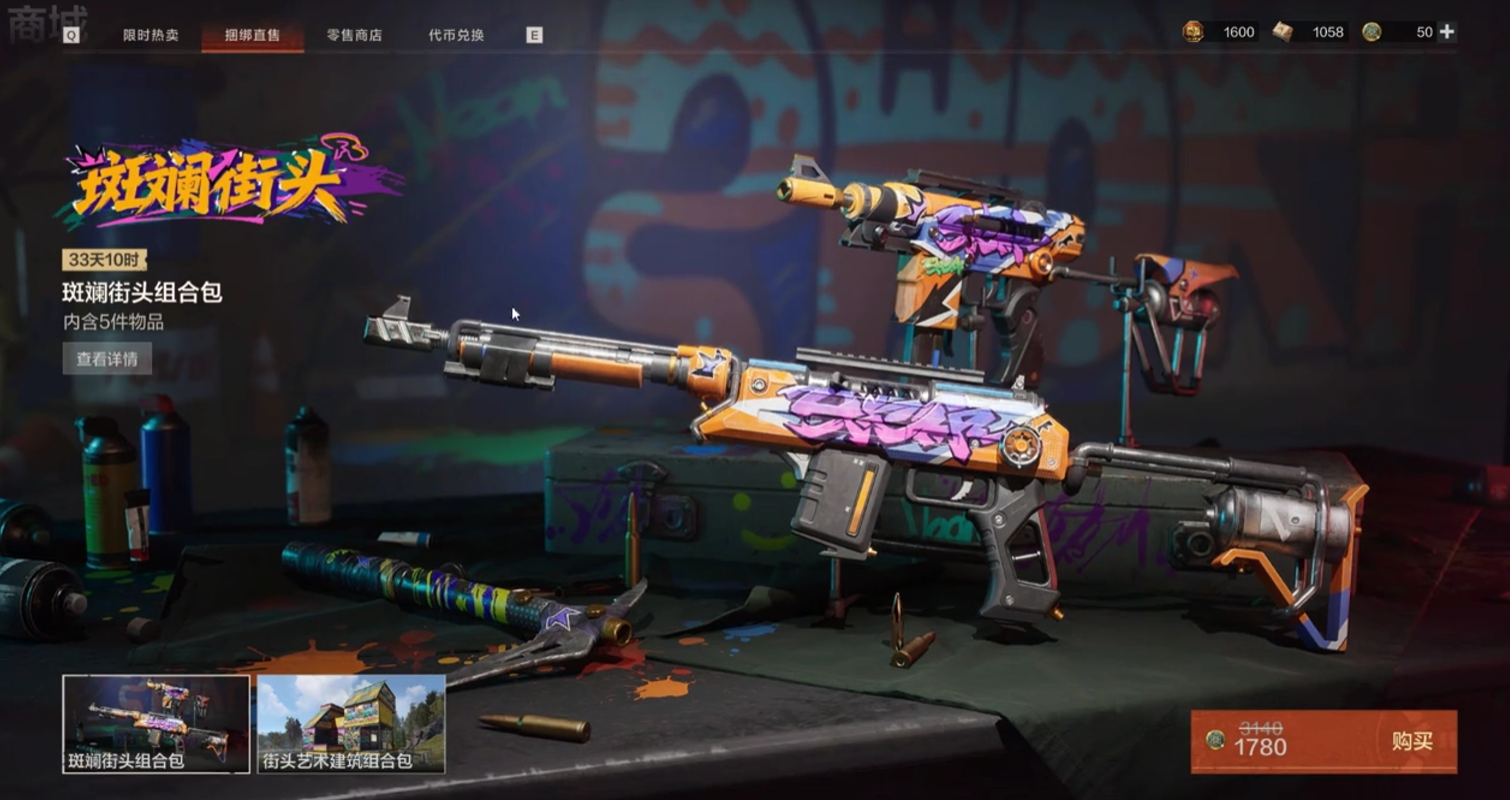 最后就是商城中的零售商店,这些都需要玩家们充值货币,游戏在这个商店之中,玩家们拥有着ak47的浅灰沙滩皮肤,以及废料件,大砍刀、匕首和改名卡都可以进行购买,玩家们可以选择自己心仪的物品进行获取,随后就是商城中的捆绑直售系列,此次的捆绑直售物品是以斑斓街头这个主题为主,这个主题甚至拥有着街头艺术建筑组合,在这个商城之中不仅拥有着冲锋枪,还拥有着半自动步枪的系列皮肤,不过这些皮肤玩家们都需要单独购买,并且注意,这些物品并不属于通行证之中。