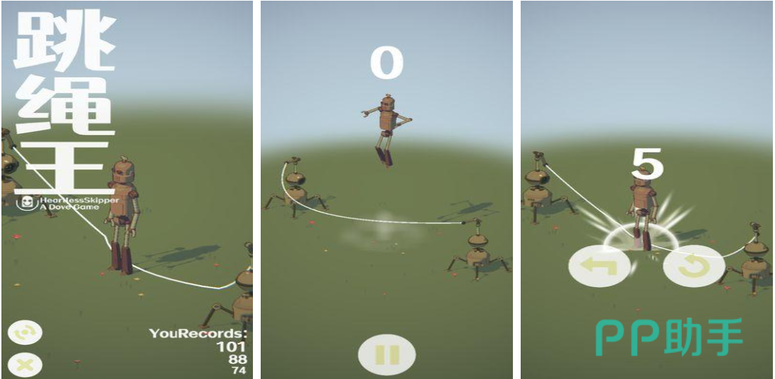以跳绳为核心机制的节奏型体能游戏,采用高帧率动画还原摇绳、起跳、落地全过程,背景场景随节奏变化切换,强化视听同步体验。内置标准计数系统,支持单摇、双摇、交叉跳等进阶动作识别,搭配BPM自适应音轨,帮助玩家建立稳定节奏感。角色采用简约木偶式建模,动作夸张却不失协调性,配合拟真绳音效与击地反馈,打造沉浸式跳绳训练环境。