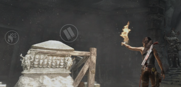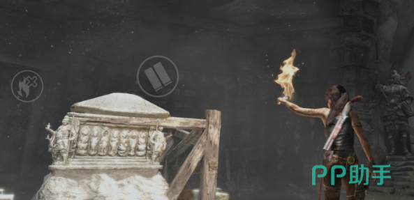 第一次开启游戏,就会进入邪马台场景,要从高处攀爬,前方就会有坠毁的飞机残骸,左边则是天然的跳板,在助跑之后,可以横向跳向对面的岩壁。在落地之后可以沿着石壁一直向左边攀爬,很快就能来到斜坡区域,这里要格外的留意地面上出现的白色箭头标志。这就是第1个可以拾取物品点的地方,打开之后就能拿到一件实用的秘宝,也算是在通关路上的一份小惊喜。在拿到秘宝之后,可以绕到古墓入口,进门需要利用斧头攀爬,点燃左边的火把,可以照明前方的道路。