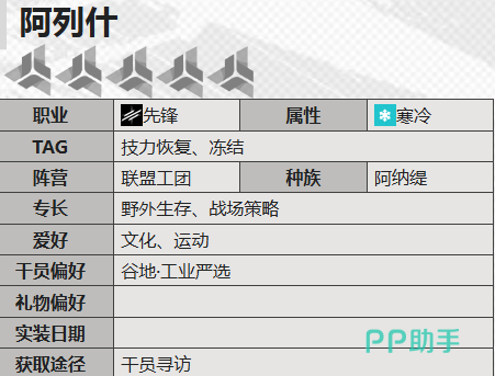 如果大家曾经接触过这一款游戏,那就会知道在游戏中有多个不同的种族。明日方舟终末地阿纳缇这是其中的一个,里面的成员不少,那今天所为大家介绍的就是阿列什。这一个先锋就会拥有记忆力恢复以及冻结的优势。不管是常规的推图,还是高难度的副本,全部都是可以去搭配的。