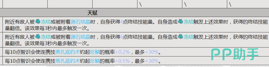 多人命中都不会浪费回能,控场加上回能可以一箭双雕,另外还会有连携技能凿孔底钓术,在敌人的脚下面会直接开一个洞,不仅会造成伤害回技能,还可以掉到钓珍鳞,要是运气比较好的话,那就会让伤害迅速的加倍,搭配潜能三,愿者上钩,全队都可以增加15%的攻击力,具有持续10秒的时间,团队的增益效果可以直接拉满。大鳞,上钩!这就是终结技能,更是一个大范围的杀招,在砸下去之后可以造成寒冷杀。潜能是可以减少15%的能量需求,潜能5打半血以下的目标,所造成的伤害就可以直接翻倍到1.5倍。