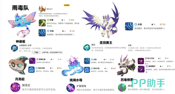 除了雨天泥沼队之外,玩家也可以关注一下雨毒队。在雨天队的基础上,可以增加中毒的机制,拥有比较出色的容错率。核心的思路是首领化之后就会触发下雨的效果,可以先给敌方挂中毒印记,接着琉璃水母就可以有效释放水系技能,让敌人的中毒层数翻倍。接着圣羽翼王靠着迅捷的技能就能有效补充伤害,这一套阵容不仅雨天的水系伤害加成可以提升,还会有持续中毒的伤害。面对肉盾阵容,也可以慢慢去磨,打起来真的还是比较稳的。