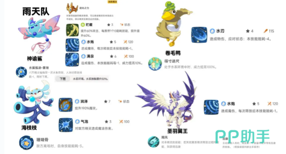 雨天队的配置主要是围绕精灵下雨效果。除了彩蝶鲨,卷毛鸭也成为主要的输出点。水刃在水系的环境中,威力直接翻倍,应对状态时,能耗就可以减4,配合雨天buff就可以直接造成炸裂的伤害。圣羽翼王虽然是异系,但可以学水系技能水泡。主要的特性就是飓风,还是比较适合这一套阵容。其他的精灵在放完相同技能之后,就可以获得迅捷。更换宠物入场时就能释放符合能量要求的技能,收割残血的效率还是比较高的。然后搭配润泽技能,可以提升魔法攻击,整套阵容简单粗暴,靠着高爆发就能打出伤害,不过缺点是容错率相对比较低。