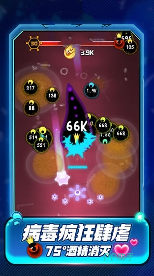 游戏把人体作为战场,描述微生物之间的激烈战争,让玩家观察小世界的变化。细胞与病菌分成阵营,角色们可爱的造型,斗志昂扬的音乐,都在展示人体自动攻击的强大,只有吞噬更多细菌,才能面对强大的病毒。小细胞可以在实验室实现提升,进化出裂变功能,玩家可以根据场景,自由的使用细胞功能,让病菌无处躲藏。