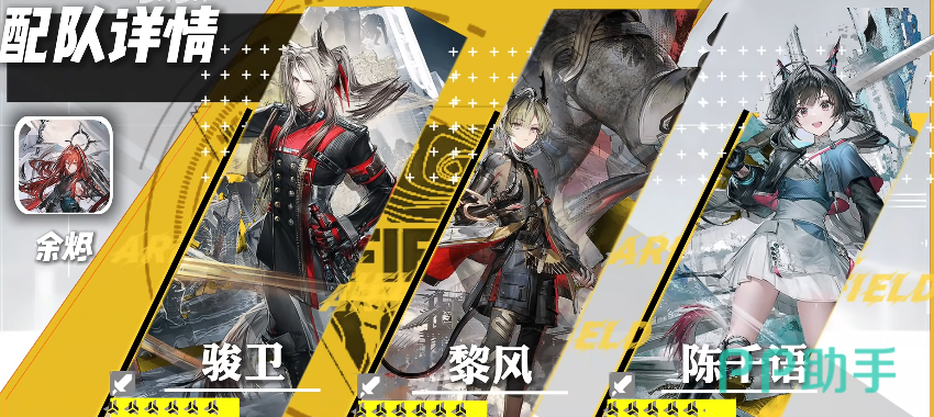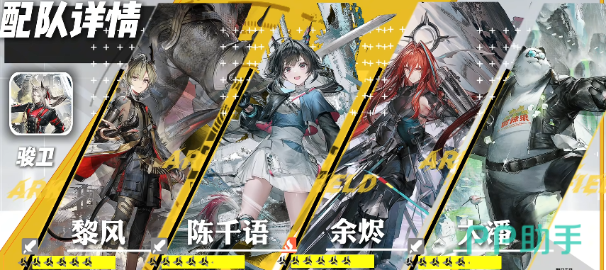 物理队的六星干员骏卫,身为全游戏面板最高之一的干员,虽然身为先锋职业,但超高的攻击力已然让他不输于任何一位输出干员,近卫的输出非常依赖高层数的破防状态,因为他的战技可以碎甲消耗所有的破防状态,基于消耗破防的层数来回对应的距离,当消耗破防后,可以激活他的连携技,根据消耗破防的层数,伤害会有对应的提升,骏卫的配队参考为骏卫、黎风、陈千羽或余烬,还有大潘,这个阵容的黎风可以造成物理脆弱,还可以获得连击buff,当然没有黎风也可以换成小羊,陈全羽或余烬,稳定叠加破防层数大,任何位置都可以消耗掉破防层数。
