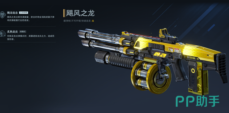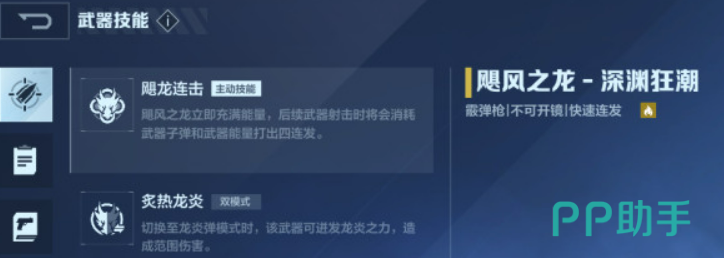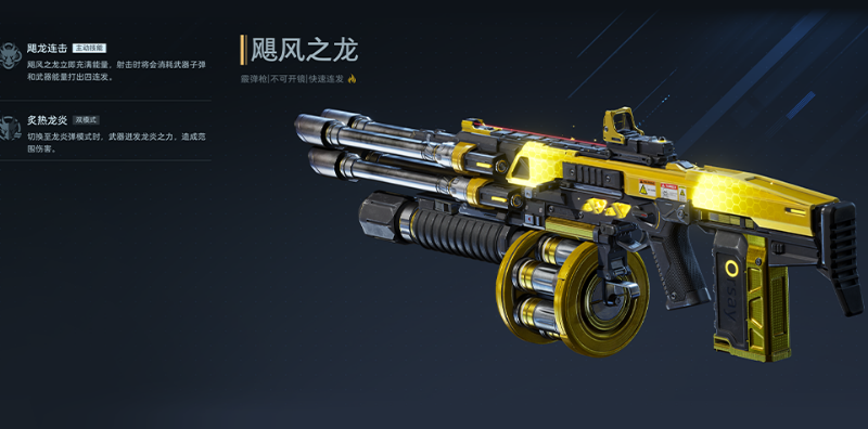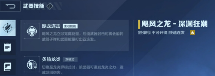 飓风之龙有两个技能,主动技能叫飓龙连击,被动技能是炙热龙炎。主动技能开启之后,接下来的攻击会消耗子弹和能量打出4连发,就算只按一下攻击键也会连续射击4次才停下来。双模式技能,炙热龙炎还可以切换成龙炎弹模式,将后前置弹夹切换会变成1发,后置弹夹就是15发,每发射一次都得重新装弹。如果在开启主动技能的状态下切换龙炎弹,前置弹夹会额外增加3发变成4发,后置弹夹相应减少但总数不变。