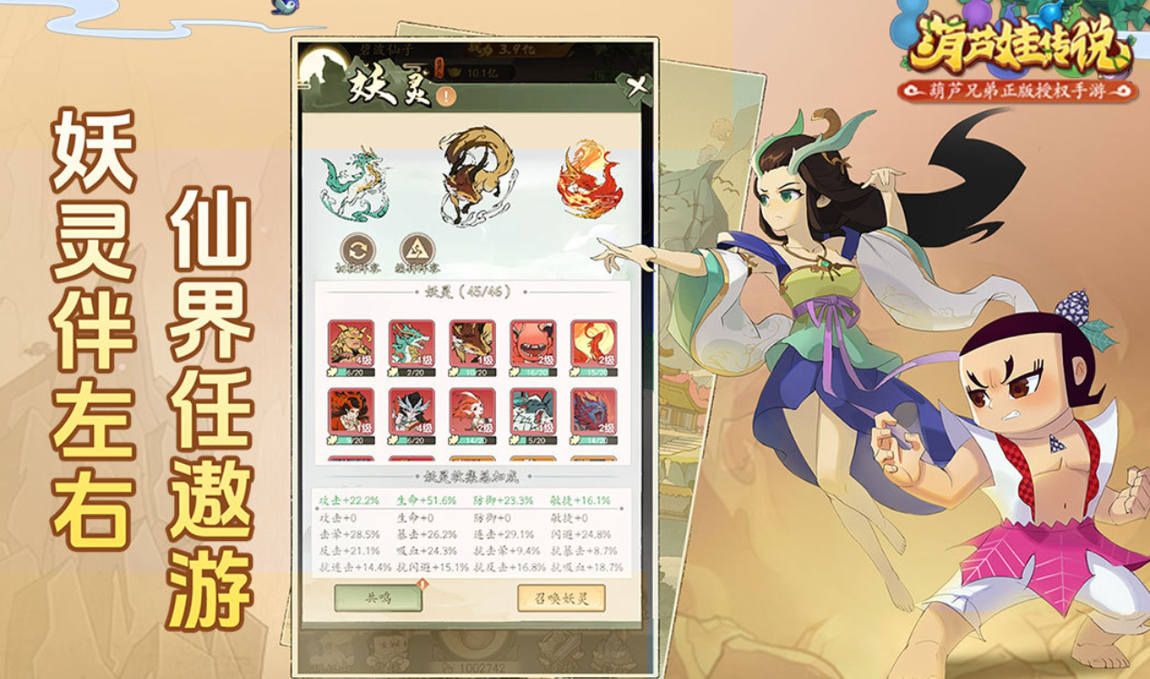 本作是加入了传说故事情节的葫芦娃主题回合制神作,化身葫芦兄弟一份子参与传说冒险的感觉更加舒适,魔幻仙界的背景呈现也任由葫芦娃爱好者遨游,设定了妖灵系统也可为葫芦兄弟增加战斗力,上美影风格的美术UI配以饱满的剧情更是游戏特色,战斗特效方面的呈现也相当花哨,快节奏回合的战斗过程更为刺激。