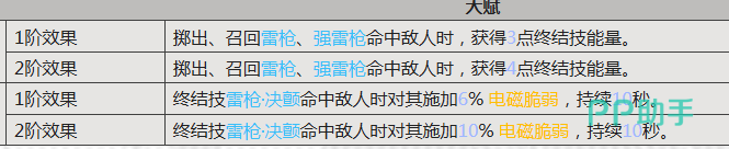天赋系统深度强化其能量循环与团队增益效能。“高效派送”使每次雷枪命中敌方单位时,最高可获取4点终结技能量,显著缩短大招冷却周期;“委婉手段”提供电磁脆弱效果,不仅提升自身对电磁抗性较低敌人的伤害效率,亦可辅助队友触发属性克制加成。五阶潜能进一步细化战力:潜能一提升技能量获取效率;潜能二延长雷枪在场持续时间;潜能三直接提高电磁属性伤害数值,构成完整成长链路。