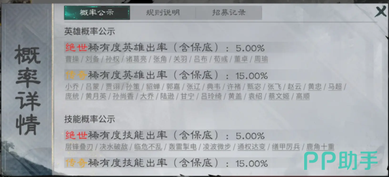 卡池角色严格依据历史人物设定,按品质划分为“绝世”与“传奇”两大梯队。其中,“绝世”武将抽取概率恒定为5%,“传奇”武将为15%,技能类道具亦遵循相同概率分布。所有角色归属及对应概率均在游戏内【概率详情】界面完整公示,确保公开透明。