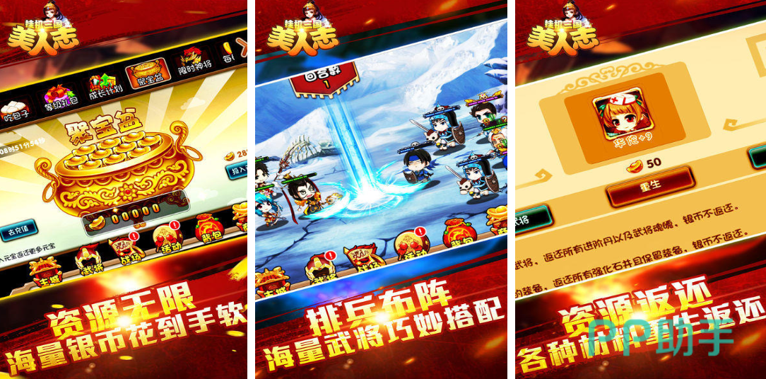这是款包含着三国历史和美人主题的卡牌回合制神作,有着无限资源的获取方式让平民小白回味无穷,可以实现放置卡牌去排兵布阵获得各种战斗快感,海量的古代武将和美人角色都可随心进行搭配,强化后的资源还可以一比一返还,这样良心不氪金的培养系统自然是小白玩家的最爱,你也试着与三国时代的古装美人一起冒险吧。