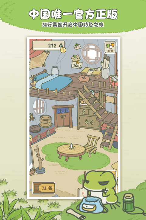 基于日本原作开发的中国定制版,保留了原版的核心玩法,玩家可以收集庭院中的三叶草当货币,给青蛙准备香葱烤包子等中式食物、水墨纸伞等道具和玉佩等幸运物,之后青蛙会自己出去旅行,随机游历故宫、西湖等中国知名景点,给玩家寄回明信片并带回兔儿爷等特产。虽然画面依然是淡雅的日系手绘加水墨风,但是内容全是中国文化元素。