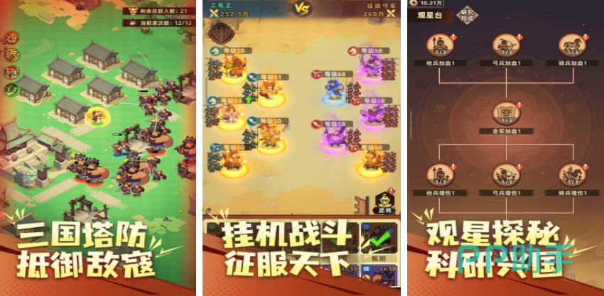 一般的三国游戏都会过于严肃,想体验更轻松的三国对战,那就可以进入到主公顶住,里面会用可爱的卡通画风,呈现出一个三国世界,玩家需要在这里采集资源,经营属于自己的国家,接着还要在游戏里放置防御塔,对抗敌军的入侵,随着挑战还能通过放置挂机对战的方式,对抗敌方阵营,想提升能力的玩家还能借助观星台研究科技,提升这些角色和兵种的伤害能力。