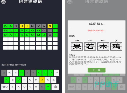 既是与拼音有关,同时也可以学习到很多的词语,包括四字成语。通过这一种方式,可以学习到古代的很多成语,还有相关的释义,完成任务的过程中,除了可以看到每一个拼音字母,而且它们也有着不同的背景颜色,可以根据他们的背景颜色让玩家更顺利的通过任务,比如当显示黄色的背景时,说明字母并不在正确的位置,所以要继续更换。