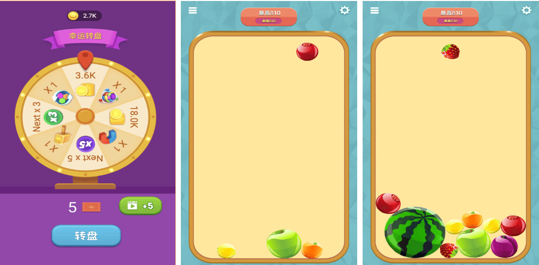 本作是款与水果元素相关的下落式合成类满分神作,小伙伴们可以尝试控制水果位置进行下落式合成,合成流程快速又有着多样古代水果可以解锁,满屏幕新鲜水果看上去也给人沉浸感,合成流程也很丝滑可以不断培养水果的大小,最终合成出西瓜就可以完成任务进入下一关,还设有大转盘的特殊系统助力大家获取更多道具。