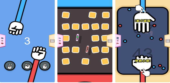 情侣双人可以试试双人快乐竞技赛这款同屏不联网的小游戏,本作包含着很多的双人比赛以及互动性的玩法,配色卡通生动也采用了积分制比拼的设定,猜拳模式以及抓小球的特色玩法也蛮有意思的,卡通生动的画面配以毫无压力的气氛都是亮点,欢乐无比的双人竞赛游戏设定也为本作加分不少,只要掌握了游戏节奏就可以快速分出胜负。