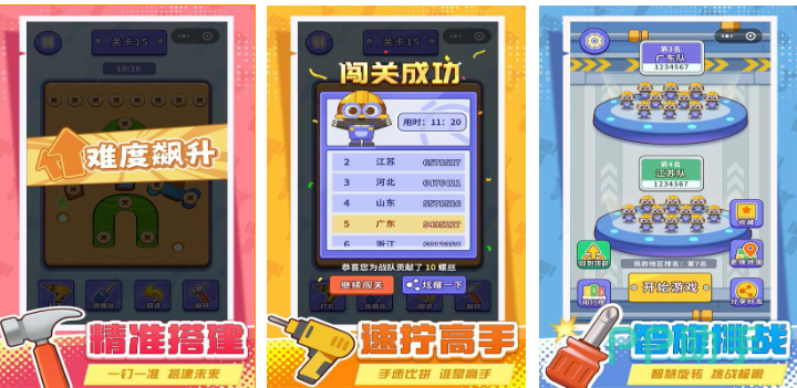 打螺丝游戏爱好者都可以在这款工业风格手游中挑战下,主打拧螺丝的基础解谜理念玩起来也很有意思,精准的拧螺丝过程呈现出的沉浸感不错,挑战模式形形色色和互动任务的加持更加有趣,拧螺丝并拆除钢板的特殊设定可玩性更高,关卡难度不高致使闯关难度更快一些,不断打螺丝带来的金属碰撞音效也十分真实哟。