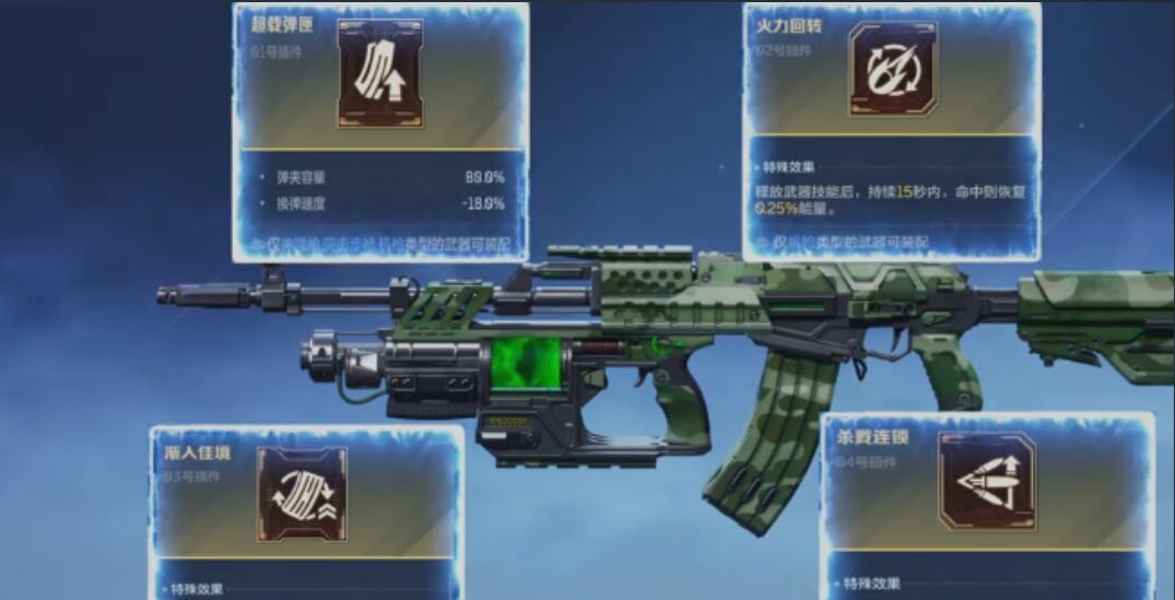 玩家如果直接使用了3号位的插件,那么在使用的过程当中,玩家将会慢慢的进入佳境的状态,因为它持续开火三秒之后就能够实现协商的作用,并且还能够额外增加30%的伤害,要是玩家在这个时候直接搭配了苔色风暴,玩家此时不仅能够拥有不换弹的特性,而且还能够让输出值在大幅度的增加。