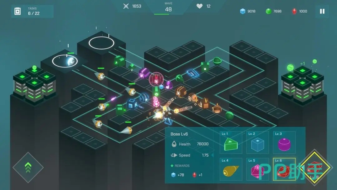 《十字防守》游戏把战场设定在了一个光怪陆离的十字路口,整个游戏都在赛博科幻风的映射下,针对炮台以及敌人都运用了流光溢彩的线条显示,而且分别针对敌我双方的防御塔,都打造出了互有攻防特性的技能,游戏里还引入了概念更为独具一格的塔防合体的玩法,设置的终极boss,支持玩家自主去进行释放对抗。