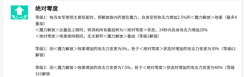 那么绝对零度这个技能对于她来说其实是跟友军相关的能力,因为她只要队友在使用这个主要技能的时候,就可以让她自身的魔力数值可以将潜力释放出来,此时她利用攻击能力增加的2.5%的百分比,也会体现在魔力解放的效果上面,最多的时候其实根据魔力解放会叠加到四层,而且在其中进行的效果达到足够上限的时候,她消耗的所有数值都会叠加为绝对零度,这个状态可以在24秒的时间当中给她带来20%的攻击力加成,而且这个层数后期还是可以通过其他方式来进行叠加,所以在绝对零度效果持续期间,她能够在场上达到足够的叠加机制,同时大家也要注意没有办法进行魔力解放的叠加,这个状态没有办法进行累积的时候,大家就只能用通过等级这样的方式来解锁的更高百分比加成了。