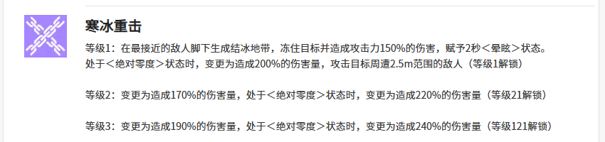 寒冰重击这个技能是根据她目前接近的敌人距离来产生一个地带,进行结冰,那么在处于结冰当中的地带里面如果有敌人存在的话,此时就可以直接将敌人给冻结住,而且这个目标来造成攻击力上面有150%的伤害数值,同时会给到2秒的眩晕效果,而且如果她在绝对零度状态当中的话,这个寒冰重击还会变成200%的伤害数值,此时只要是站在她周围2.5m范围当中的敌人都会受到这样的一个伤害能力,后期达到等级提升以后还会有变更的百分比,可以快速进行提升。