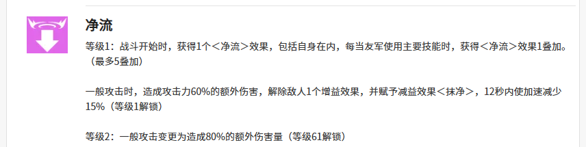 第四个技能就叫做净流,这个技能在一开始的时候就可以获得净流的状态,进行自身以及其他队友身上的加成之后,净流的加成只有在我方角色使用主动技能的时候才可以进行触发,也就是此时获得了净流状态叠加的话达到5层叠加,一般在攻击的时候造成的额外伤害数值就有越多,一层可以带来60%的提升效果,而解除掉敌人身上的一个增益之后还可以赋予减益效果叫做抹净,抹净这个减益给到敌人是在12秒时间之内减少掉15%的加速能力,所以让敌人的移速减慢之后,大家还可以用接下来的技能叫做波涛汹涌。
