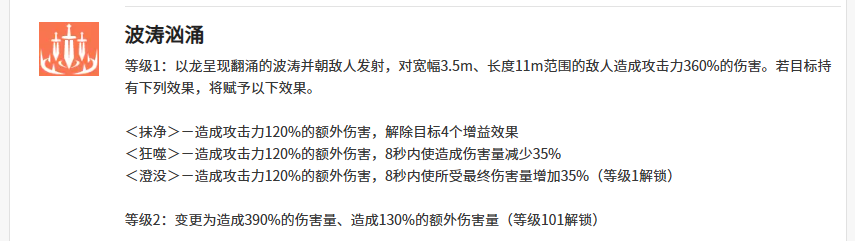 波涛汹涌这个技能是根据前面召唤出来的龙,来对敌人进行发射输出,但是爆炸范围攻击的敌人只要处于智河的攻击范围之内,都会受到360%的伤害,如果持有下列各类效果的话,也会赋予到不同的增益能力,比如澄没、狂噬、抹净在这里都是可以进行触发的,那么在这里基础的触发这是效果的话,其实都会带来120%的额外伤害,不同的是后面的词条进行减益净化,还有伤害量减少以及最终伤害量增加都是可以进行变更的,而智河当做队长的时候,其实带来的幻流这个技能效果也可以当做精灵主要使用的技能。