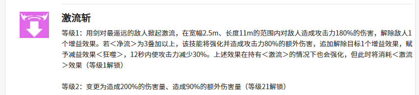 而激流斩这个技能相对他来说的话在非常大的范围当中对敌人进行攻击,会有180%的伤害之后解除掉敌人身上增益,此时如果根据净流效果再来提升的话,也是要保证智河在自己身上有三层净流进行加成的时候,才可以根据这样的技能来进行强化,造成80%的额外攻击伤害,而且在追加接触敌人身上的输出之后,则这个目标可以附带一定的减益效果,叫做狂噬,狂噬这个减益效果给敌人之后,就在12秒的时间之内敌人身上的攻击力会减少掉30%,而且这个效果在有净流的情况下同样也会进行强化。