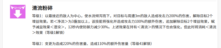 第三个技能叫做清流粉碎,这个技能对于当前的智河来说可以快速接近敌人,然后对敌人造成200%的攻击伤害,解除掉的增益效果是一次性减少到两个,计算了敌人身上的增益之后,可以根据智河的效果来强化自身的攻击能力吗,她造成的额外伤害会有100%的数值,此时进行追加的话,同样也是再一次驱散两个增益状态,而赋予对面的减益会有沉默的效果,在12秒时间之内会让敌方的防御能力减少30%。