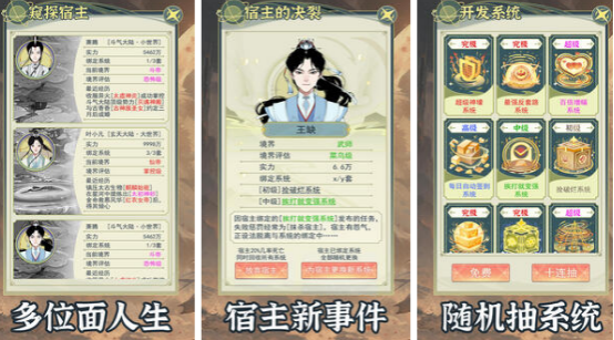 穿越时空为主题,较为完整的模拟经营,有全新的系统特色,将在修仙世界中成长修炼,较为出色的动态系统,战斗、修仙等多元位面世界。通过规划宿主修行路线,选择相应的学习功法及门派,应对种种随机事件,由于随机度极高,因此还能够触发很多隐藏故事,并管理资源,影响具体的剧情走向和相应结局。