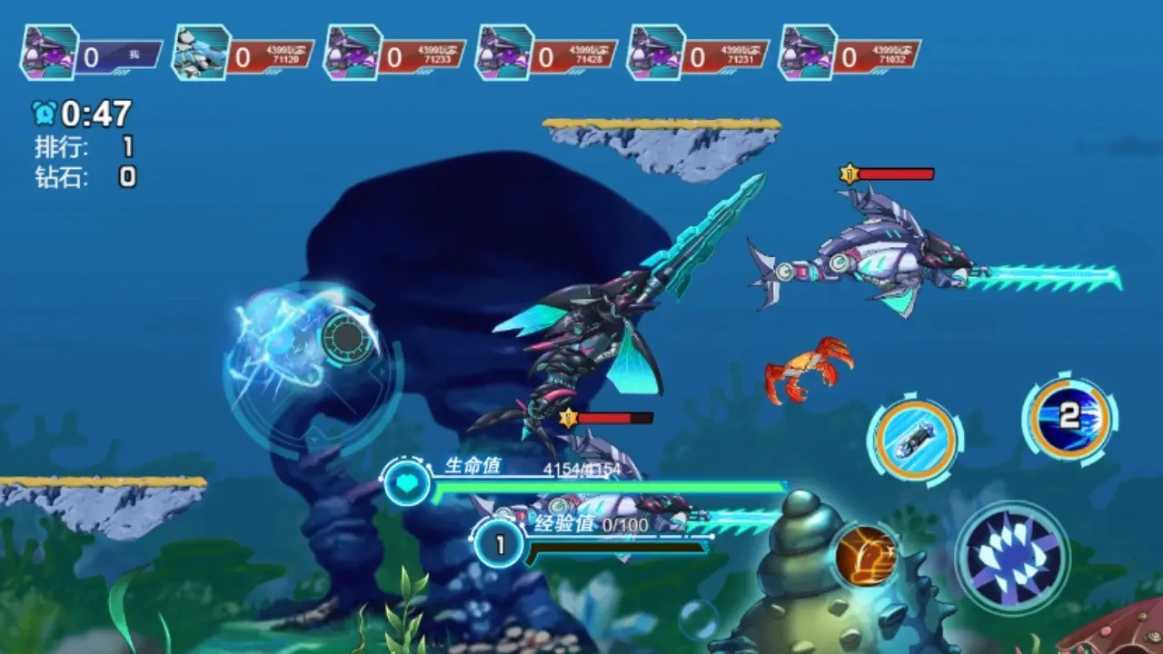 一个3D海洋生存进化类休闲手游,玩家开局就可以选择机械鲨鱼或八爪鱼两种初始角色,前者速度快、攻击力高还有激光炮等武器,后者触手范围大,但是速度较慢,适合伪装伏击,玩家需要通过吞噬小鱼积累经验升级,分配技能点强化自身属性。虽然游戏设计了单人模式的生存挑战,但是主要玩法是pvp的排位赛和boss挑战。