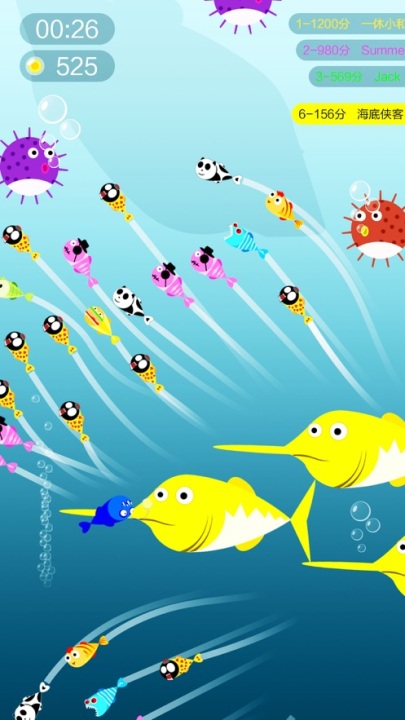 一个多人休闲竞技手游,游戏在大鱼吃小鱼的基础上加入了鱼群的设定,单指滑动可以操控鱼群吞食浮游生物、小鱼和金币不断发展壮大,双指捏合或者分开能让鱼群实时拆分重组躲避天敌或合围反击。游戏设计了普通、稀有等四个等级的鱼群种类,都有各自的独特能力而且有进化次数区别,游戏支持多人竞技、生存挑战等多个模式。