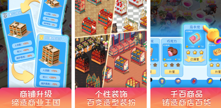 梦想成为超市老板的朋友可以在这款手游中轻松实现梦想,本作是充满个性的一款经营超市的主题手游,商铺可以轻松升级并开发专属的经营流程,个性化的装饰玩法可以让自己的超市看上去更为精致,百余种商品都可以随意放置经营带来更多惊喜,独创的经营任务加持帮助大家开发商业帝国,充满娱乐性的气氛渲染更是本作的亮点,超市经营类手游粉丝都可试试本作哟。