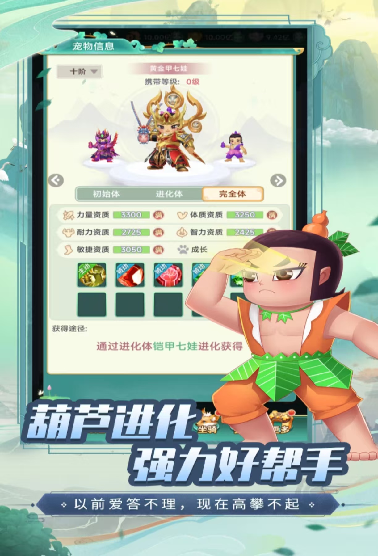 《葫芦娃:奇幻世界》将游戏内的7个葫芦娃作为故事的主线,每个葫芦娃都分别拥有着不同的能力,可以利用他们独特的神功去对抗妖怪们。还可以运用到丰富的坐骑体验,可以进入到无尽的试炼闯关中,会逐渐的获得更多强力的装备使用。主线任务和支线的任务都非常的精彩,日常可以选择体验副本,角色还拥有丰富的皮肤选择,后续需要不断的为角色完成进化。