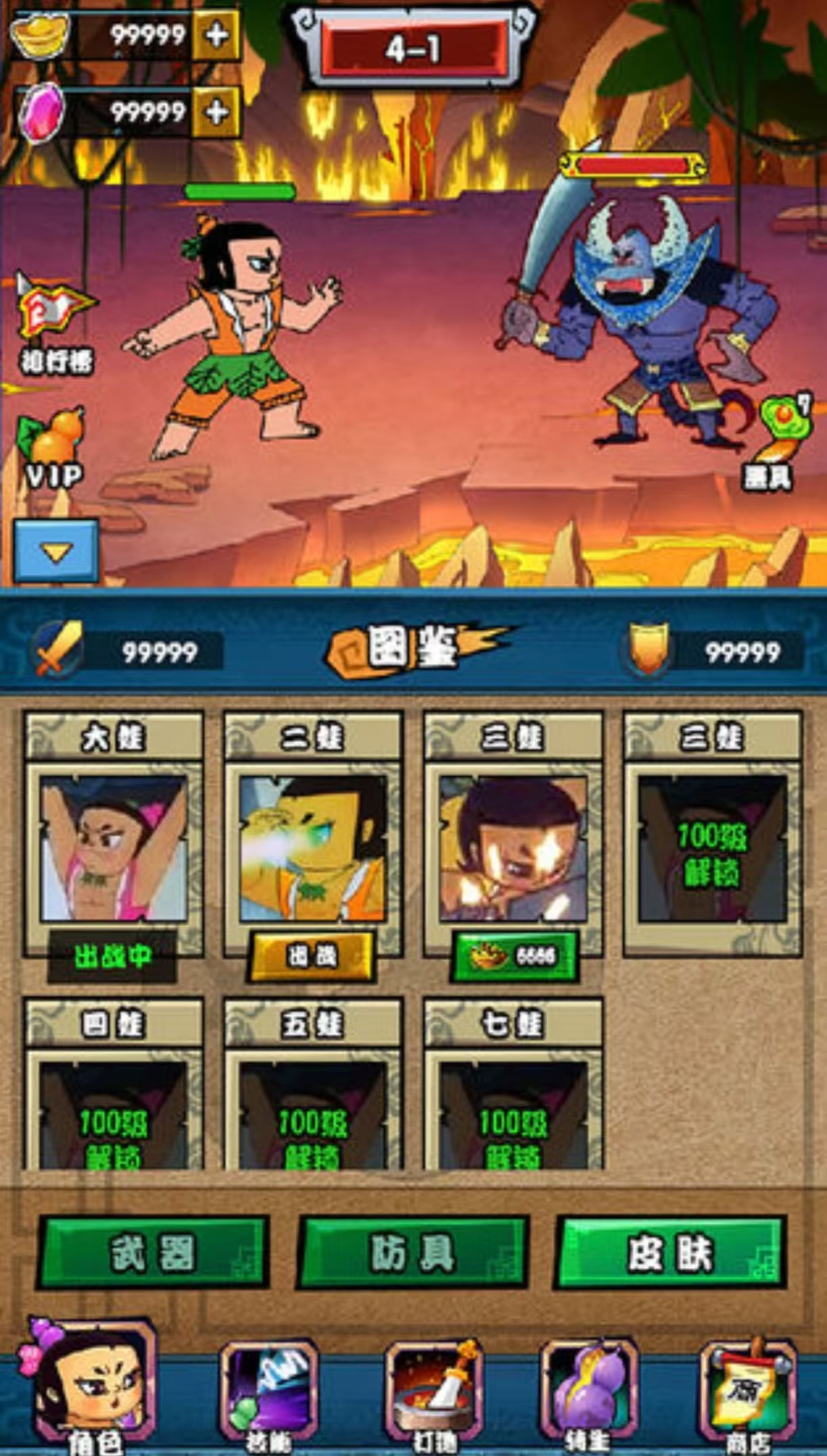 《葫芦娃大冒险》带来了葫芦娃动画片里面的剧情,需要和很多游戏中出现的怪物进行对决,帮助葫芦娃顺利的救出爷爷。闯关的过程中还会解锁更多新的招式,角色的攻击和防御各种属性都可以提升,还可以选择和好友默契的进行搭配。可以尝试选择不同的角色技能进行攻击,过程中收集越来越多丰富的道具,在游戏里面的商城中也可以购买道具,需要玩家消耗闯关获得的金币。